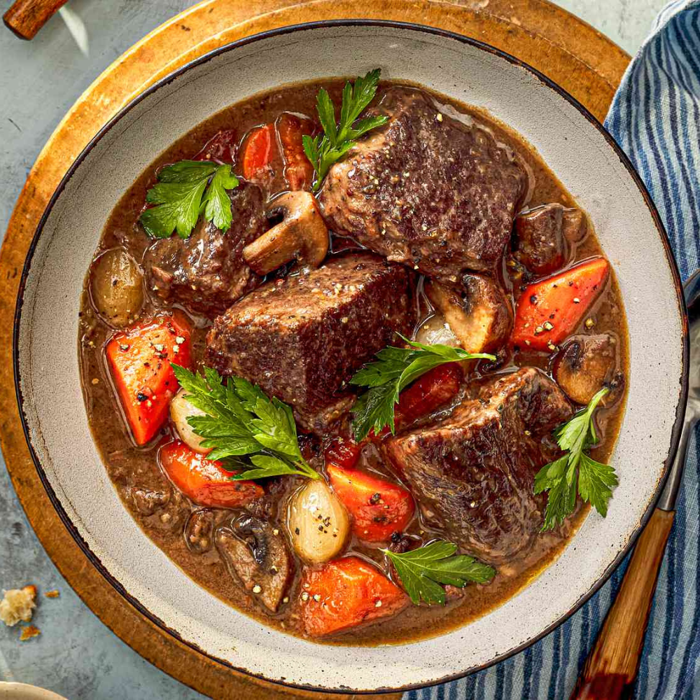 Le grand classique, longuement mijoté, servi avec ses carottes fondantes et pommes de terre vapeur.