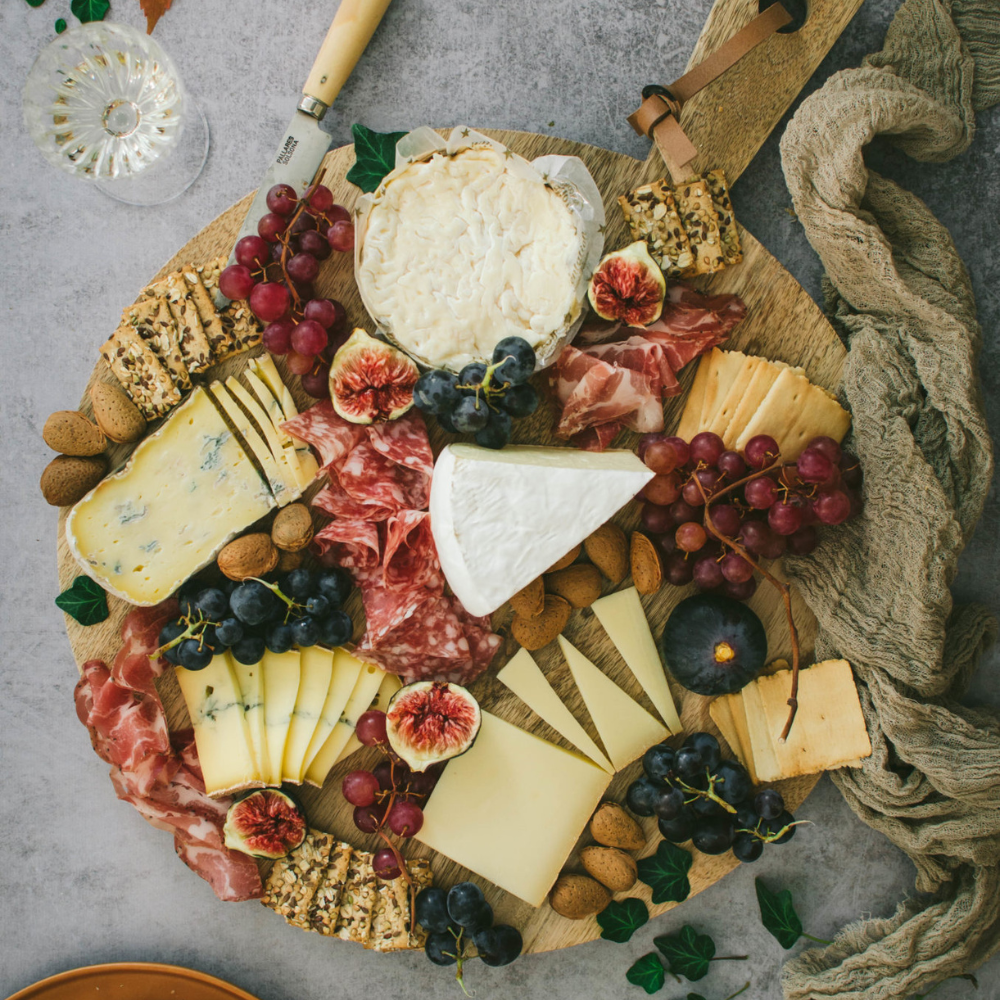 Sélection de trois fromages français : Saint-Nectaire, Tomme de Savoie, et Comté 18 mois.