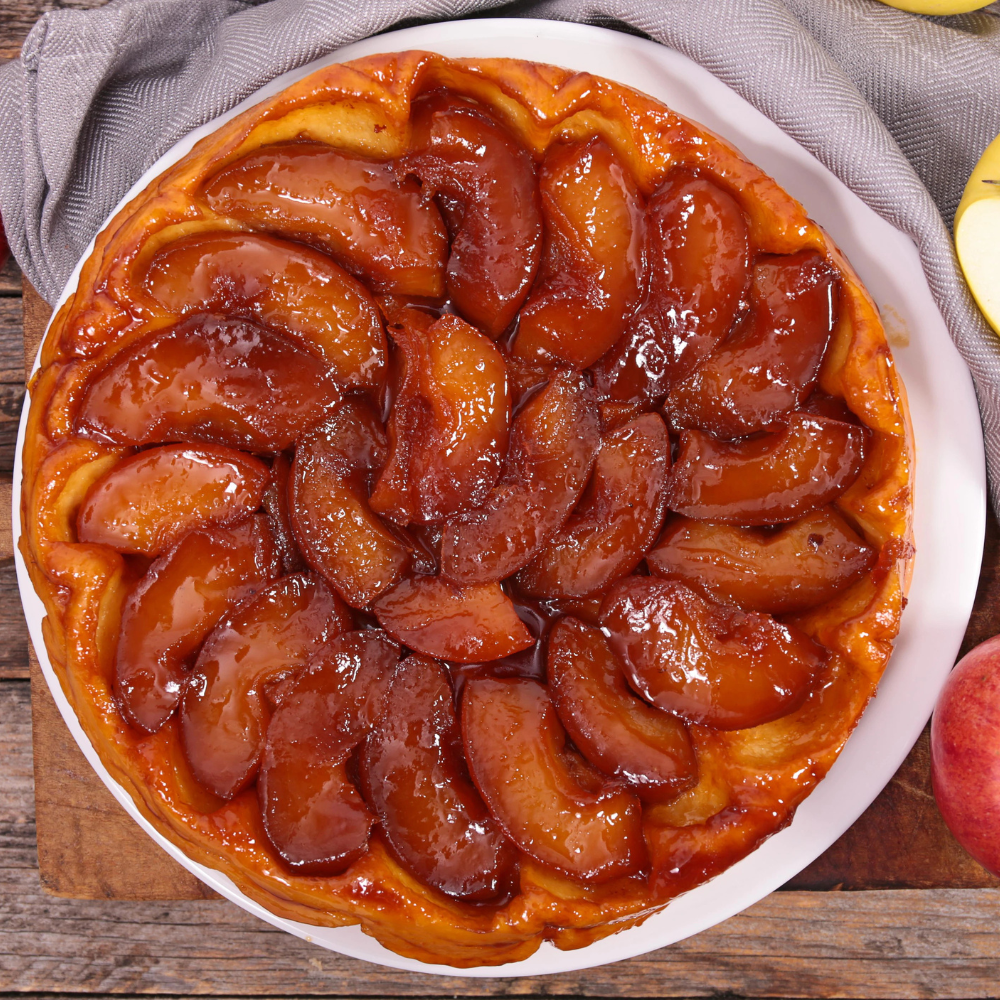 Pommes caramélisées lentement au beurre salé, pâte brisée croustillante… servie tiède.
